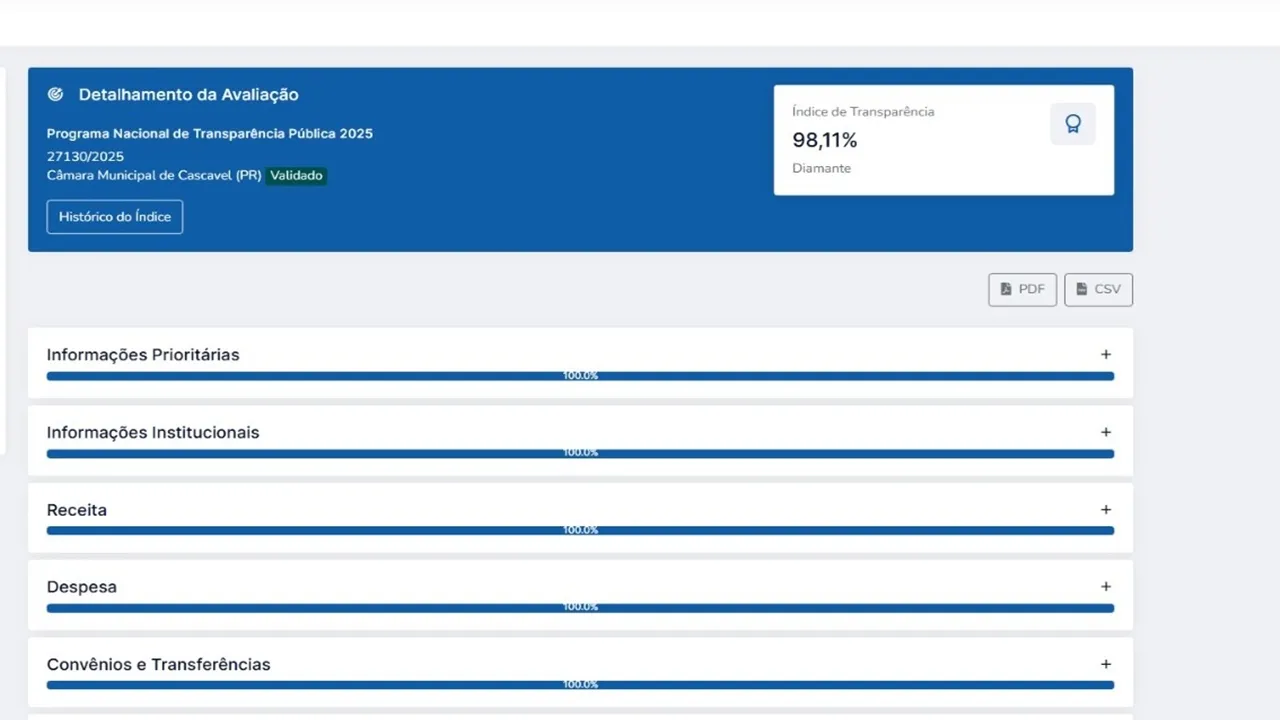 A Câmara Municipal de Cascavel atingiu, em 2025, a maior pontuação já registrada no Índice de Transparência da Administração Pública do Tribunal de Contas do Paraná. Com 98,11%, o Legislativo também alcançou a maior classificação dentro do programa e passou da categoria Ouro para Diamante.