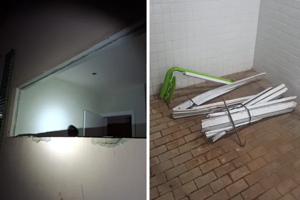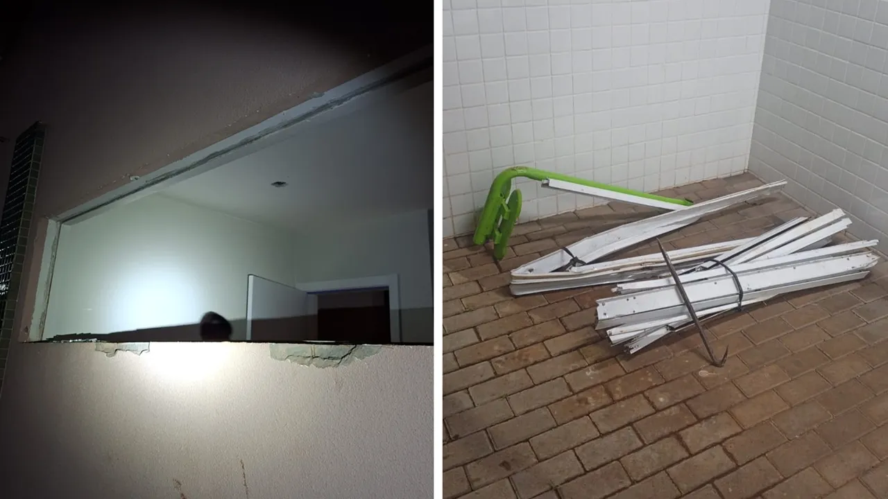 No local, os agentes encontraram com o suspeito um pé de cabra, perfis de janela que já haviam sido retirados e parte de um aparelho de ginástica de ferro pertencente à praça pública. O material estava separado, indicando possível tentativa de furto.