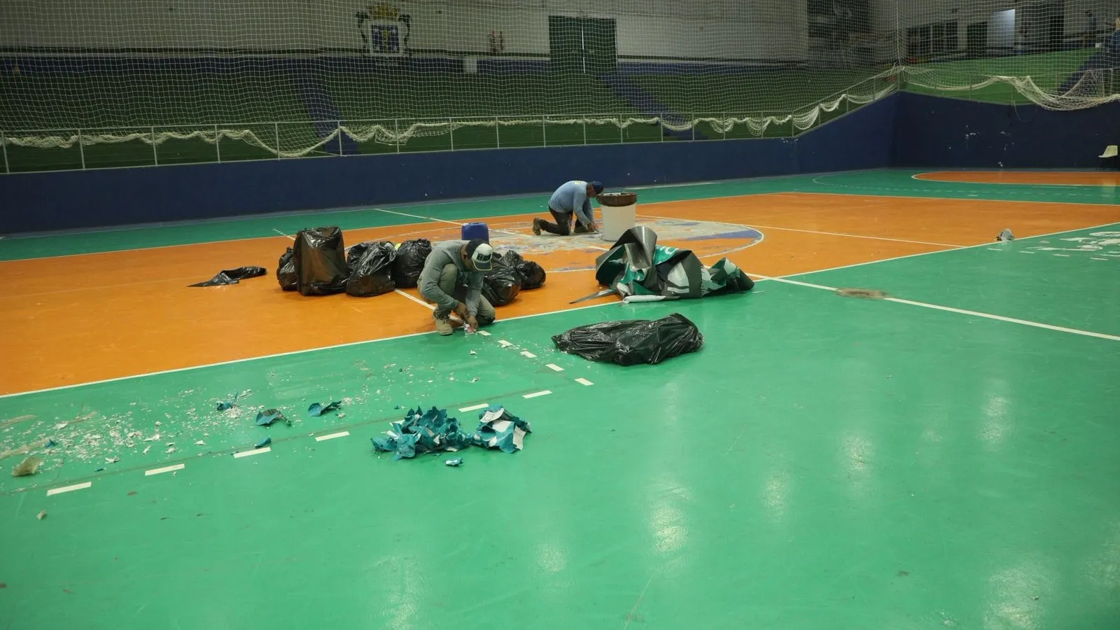 Os trabalhos começaram nesta terça-feira (16) e incluem a pintura de toda a quadra, das arquibancadas e da orla do ginásio. A execução seguirá até a primeira quinzena de janeiro de 2026, com interrupção programada durante o recesso de fim de ano.