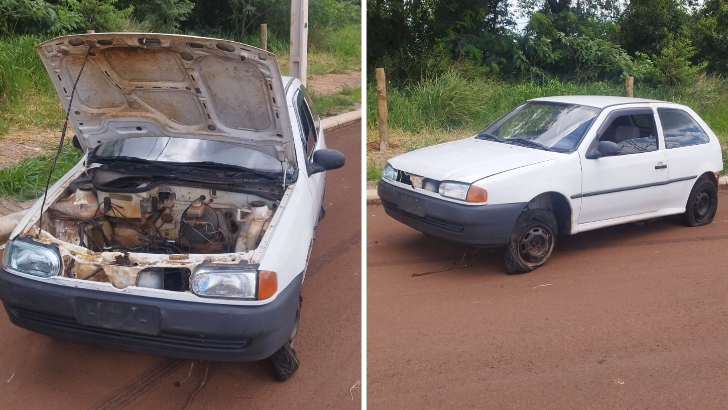 A equipe policial se deslocou até a Rua Diego André Goetz Kroth, onde localizou o veículo em estado de depredação. No local, foi constatado que o automóvel estava sem placas, com os pneus totalmente rasgados e sem o motor.