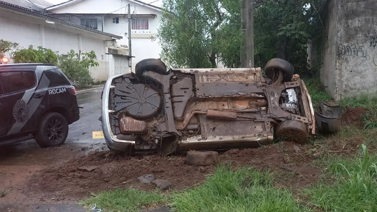 Já nas proximidades do bairro Jardim Itaipu, o condutor perdeu o controle da direção, saiu da pista e capotou após colidir contra um poste de energia. Apesar do impacto, ele não sofreu ferimentos e foi preso no local. Devido ao risco de fuga, foi necessário o uso de algemas.