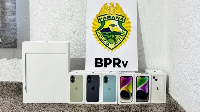 Os produtos estavam armazenados atrás do banco do motorista, acondicionados em duas sacolas brancas. Durante a conferência, realizada na presença do condutor, foram contabilizados os seguintes itens: um MacBook Air, quatro unidades de iPhone 17, dois iPhones 16, um iPhone 15, dois iPhones 14 e três iPhones 13, totalizando 13 produtos eletrônicos.