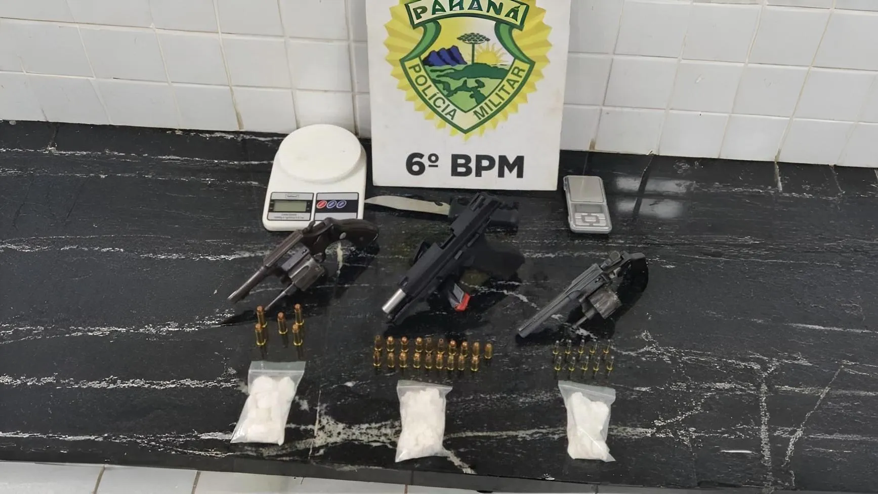 Com o avanço da ocorrência, o material foi sendo contabilizado ainda no local. Foram apreendidos um revólver calibre .38, uma pistola calibre .380 e um revólver calibre .22, além de munições de diferentes calibres, totalizando 34 projéteis. Também foram encontradas 136 gramas de cocaína, duas balanças de precisão, uma faca utilizada para fracionamento da droga e a quantia de R$ 550 em dinheiro.