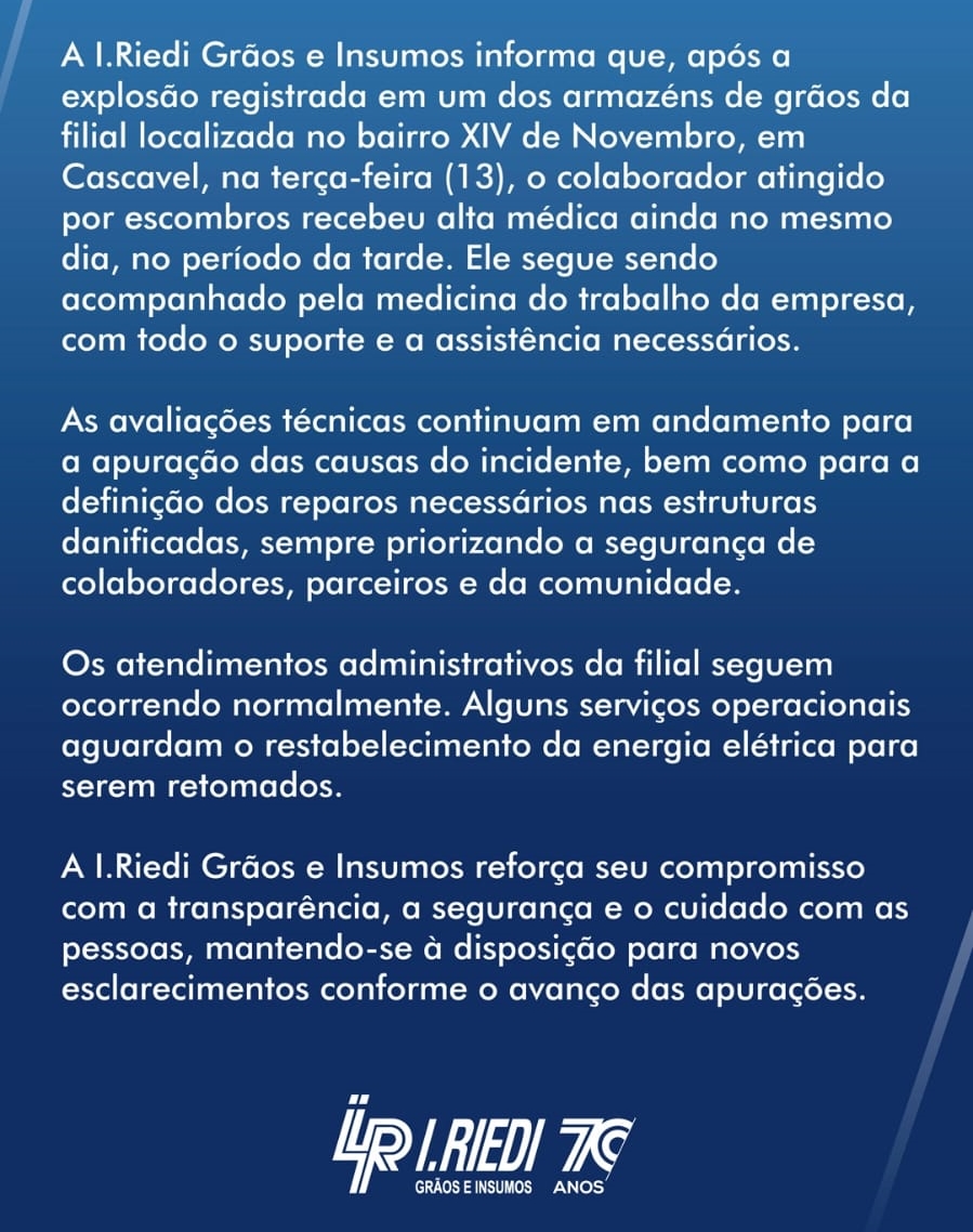 Câmeras de segurança registraram o momento em que uma explosão atingiu um armazém de grãos de uma empresa localizado no Bairro 14 de Novembro, em Cascavel, às 11h32 da manhã de terça-feira (13). O impacto foi suficiente para provocar danos visíveis na estrutura do local, levantar uma densa nuvem de poeira e espalhar estilhaços pela área, chamando a atenção de quem estava nas proximidades.