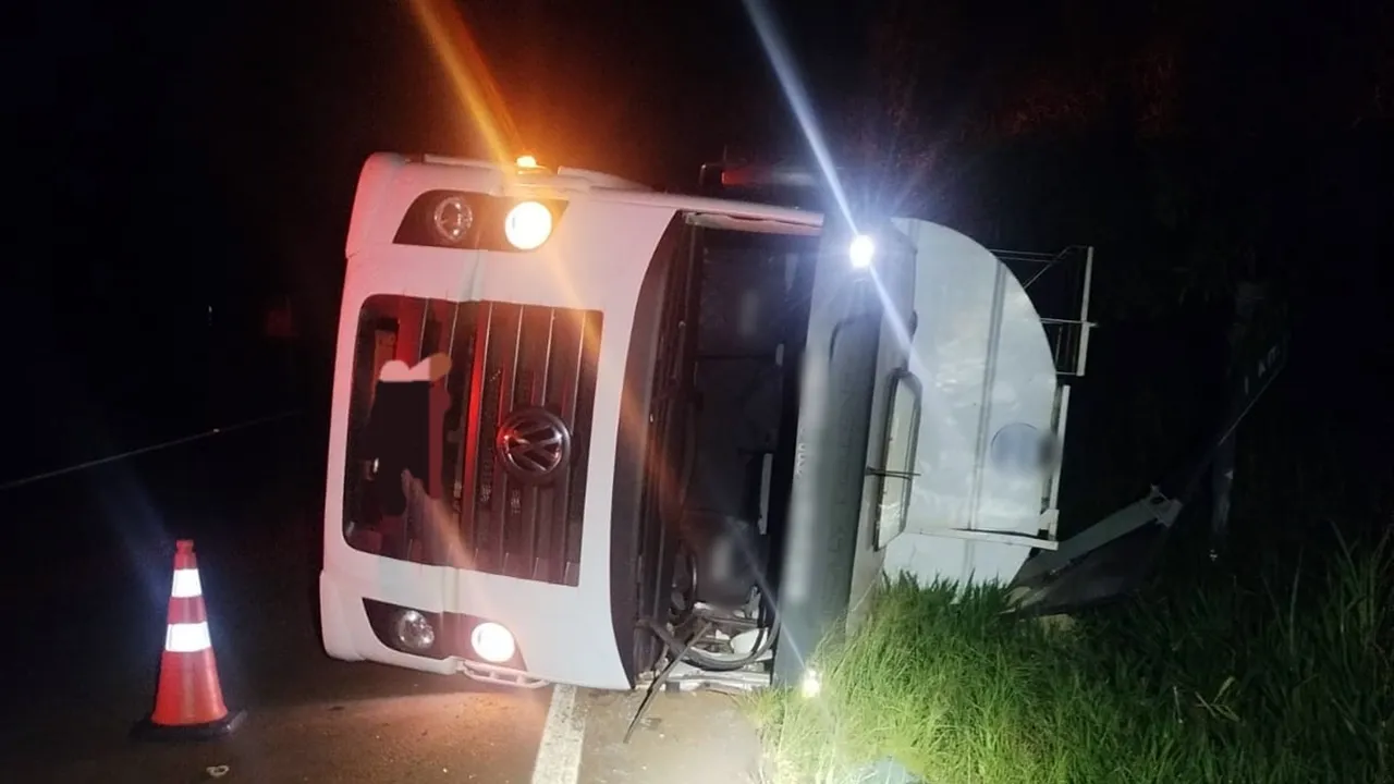 Caminhão VW 30.280 tombou na madrugada desta terça-feira no km 599+500 da PR-364, em Palotina; motorista de 55 anos teve ferimentos leves.