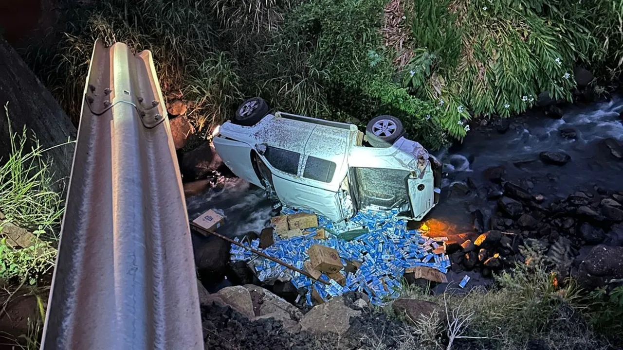 Durante a ação, um veículo VW Amarok com placas de Witmarsum (SC) desobedeceu ordem de parada e seguiu em deslocamento perigoso por cerca de 10 quilômetros, cometendo diversas infrações e colocando outros usuários da via em risco. A tentativa de escapar terminou quando o veículo saiu da pista ao cruzar uma ponte em uma estrada vicinal, rompeu o parapeito e caiu no rio, espalhando parte da carga. A situação também provocou dano ambiental e prejuízo ao patrimônio público. O condutor fugiu para uma área de mata e não foi localizado.