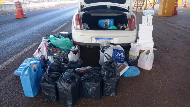 Os policiais deram ordem de parada a um veículo I/Citroën C4, ocupado por dois homens, sendo o condutor de 47 anos e o passageiro de 23 anos. Durante a fiscalização, foi localizada grande quantidade de produtos de origem estrangeira acondicionados no porta-malas e no banco traseiro do veículo.