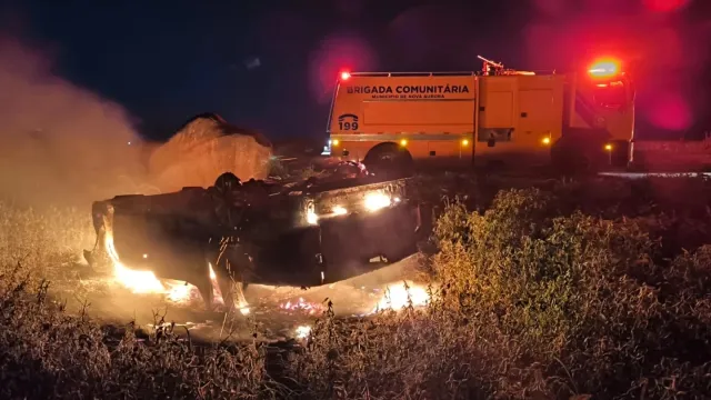 Um grave acidente foi registrado na rodovia PR-180 e resultou em um incêndio de grandes proporções em um veículo que capotou e saiu da pista. A ocorrência mobilizou rapidamente as equipes da Brigada Comunitária de Nova Aurora, acionadas após o automóvel ser tomado pelas chamas logo após o capotamento.