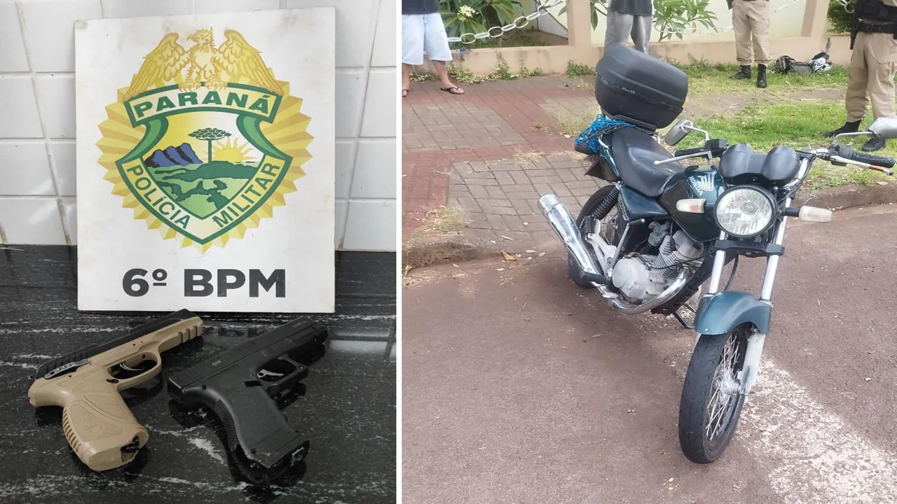 No local, os policiais realizaram a abordagem dos três masculinos e, durante a ação, localizaram duas pistolas de pressão calibre 5.5mm. Um dos abordados, com 16 anos, assumiu a propriedade dos objetos apreendidos. Ainda durante o atendimento da ocorrência, foi constatado que uma motocicleta pertencente a outro envolvido, de 19 anos, apresentava irregularidades administrativas, resultando no recolhimento do veículo por infrações de trânsito.