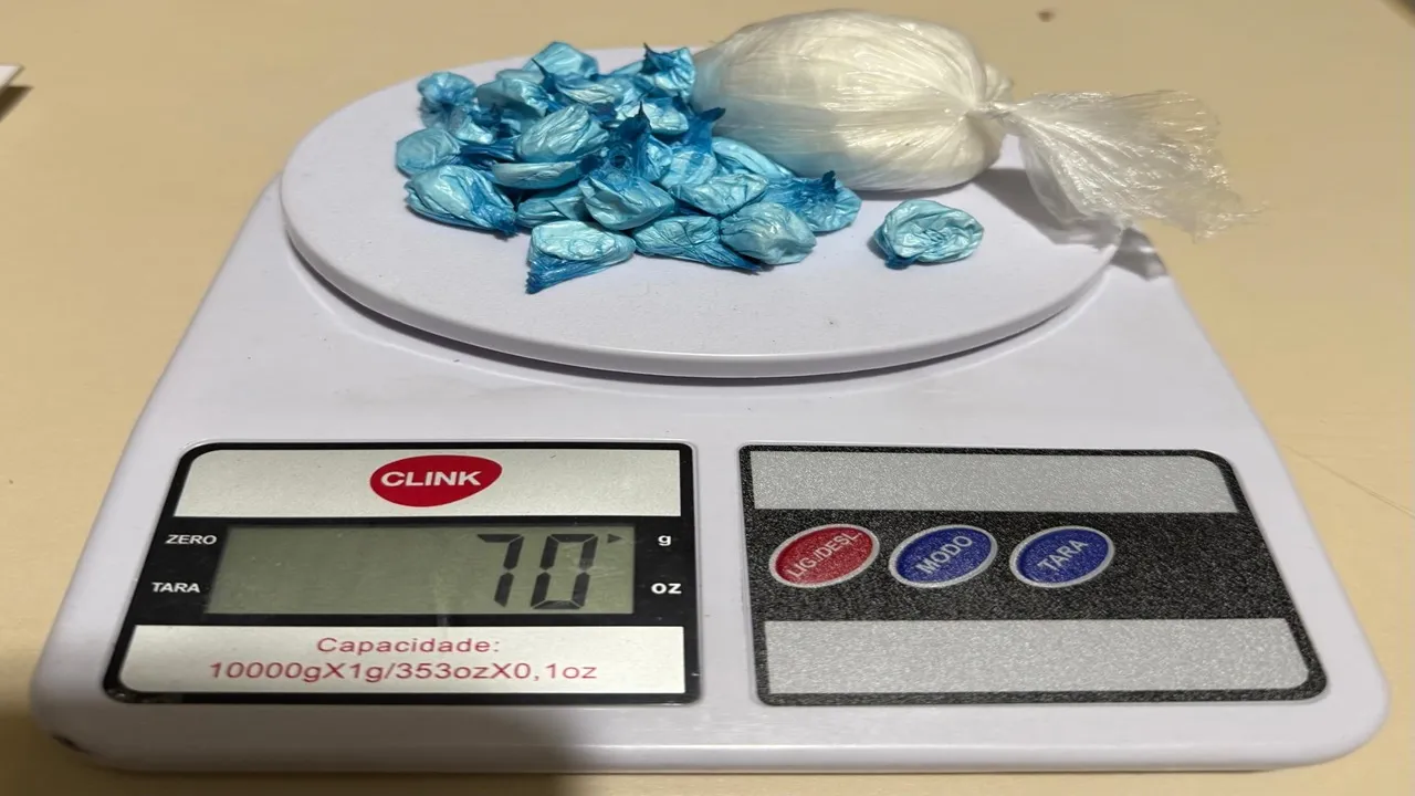 Na sequência da abordagem, ao inspecionar a carteira do condutor, os policiais encontraram um compartimento com zíper onde estavam escondidas 32 porções da mesma substância, embaladas em sacos plásticos azuis. O material adicional totalizou 20 gramas. A soma das apreensões chegou a 70 gramas de cocaína.