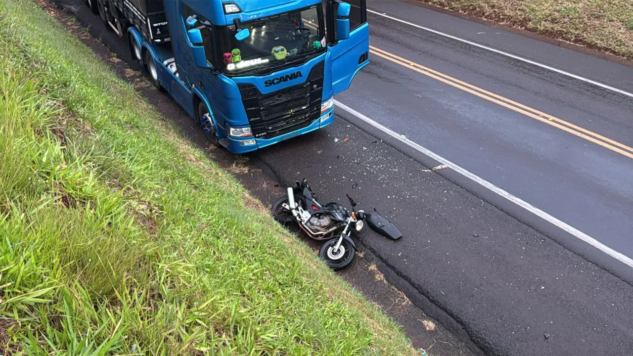 Colisão entre caminhão, moto e carro ocorreu perto do Viaduto Carelli, deixou motociclista ferido e mobilizou a PRF na BR-277.