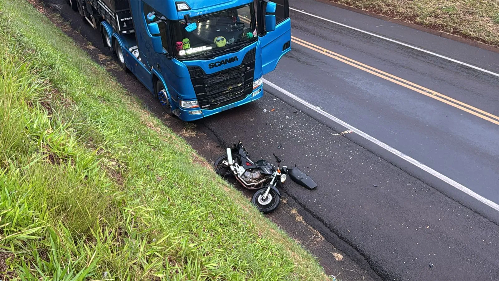 De acordo com as informações apuradas no local, uma motocicleta Honda Twister e um Fiat Palio seguiam pela rodovia quando foram atingidos por um caminhão que não conseguiu frear a tempo, provocando um engavetamento. O piloto da motocicleta, um homem de 30 anos, sofreu ferimentos leves e foi encaminhado a uma unidade hospitalar para reavaliação.