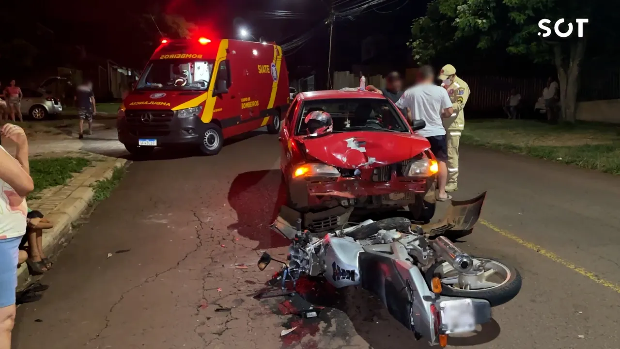 Uma forte colisão de trânsito foi registrada na noite deste domingo (15) no Jardim Novo Milênio, no bairro Canadá, em Cascavel, e deixou um homem ferido após a batida frontal entre um carro e uma motocicleta. O acidente ocorreu na Rua Antônio Damian, no cruzamento com a Rua Ivo Stengler, e chamou a atenção pela destruição dos veículos envolvidos.