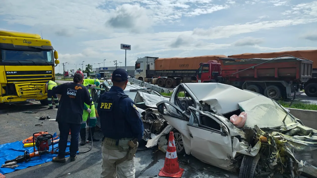 A batida aconteceu por volta das 10h20 e exigiu uma resposta rápida das forças de emergência. A Polícia Rodoviária Federal foi acionada e atuou com apoio do Núcleo de Operações Aéreas, enquanto equipes do SAMU e do Siate chegaram ao trecho após a regulação do chamado. Ao chegar ao ponto do acidente, os socorristas confirmaram que a vítima estava presa às ferragens de um dos veículos.