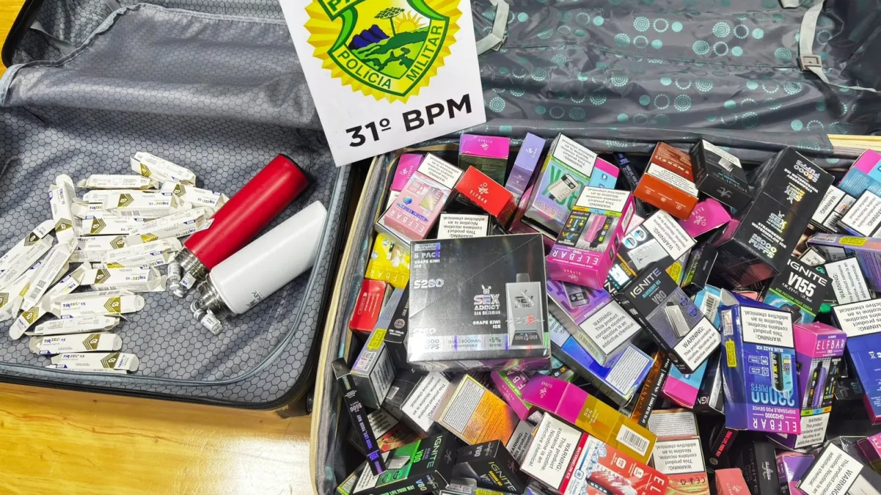 Durante as buscas, a equipe localizou duas malas com mercadorias irregulares. Em uma delas, foram encontradas ampolas de medicamentos de origem estrangeira, armazenadas em recipientes térmicos e sem qualquer documentação legal de importação. Na outra bagagem, havia diversos dispositivos eletrônicos para fumar, conhecidos como cigarros eletrônicos, também sem regularização aduaneira.