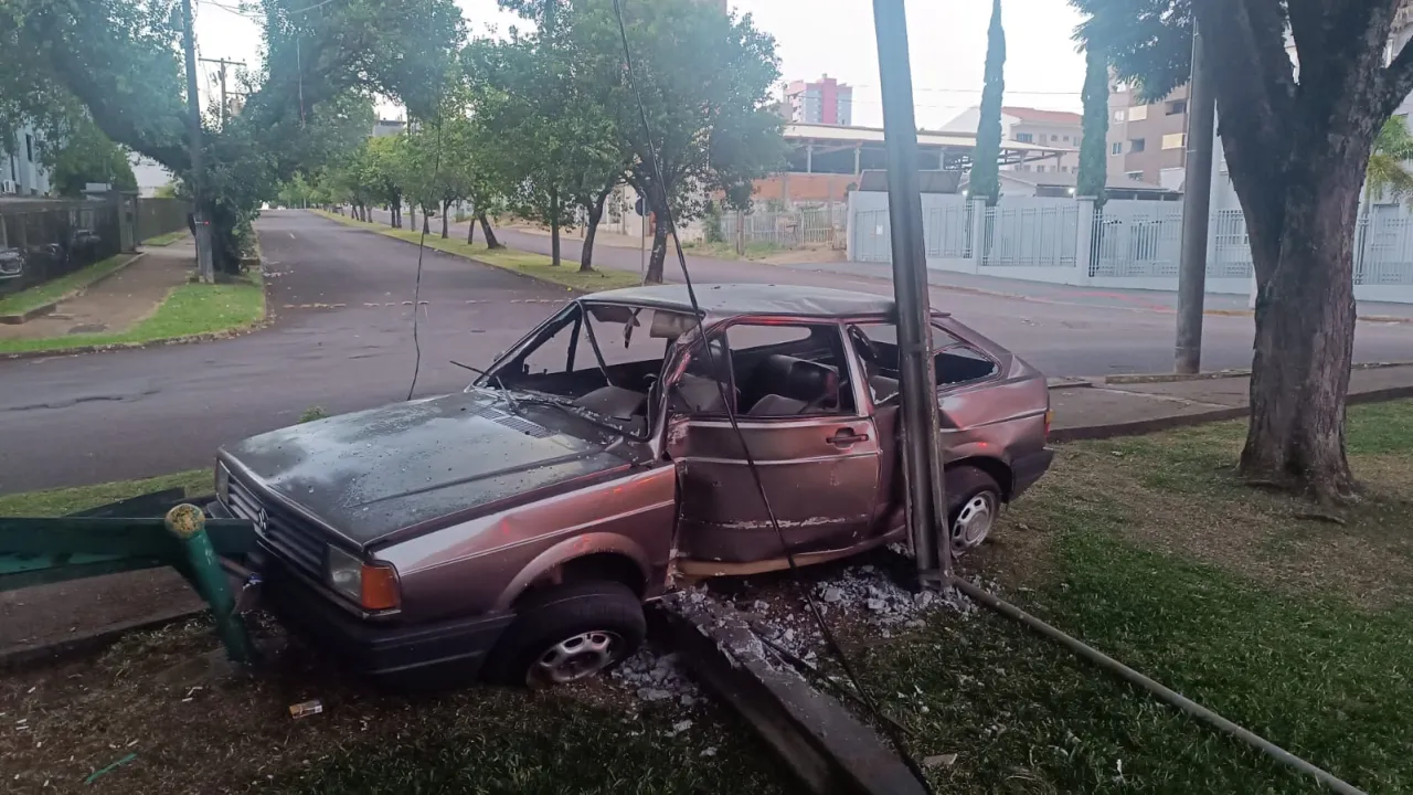 Motorista foge após bater carro em poste e abandona veículo no Bairro Tropical em Cascavel