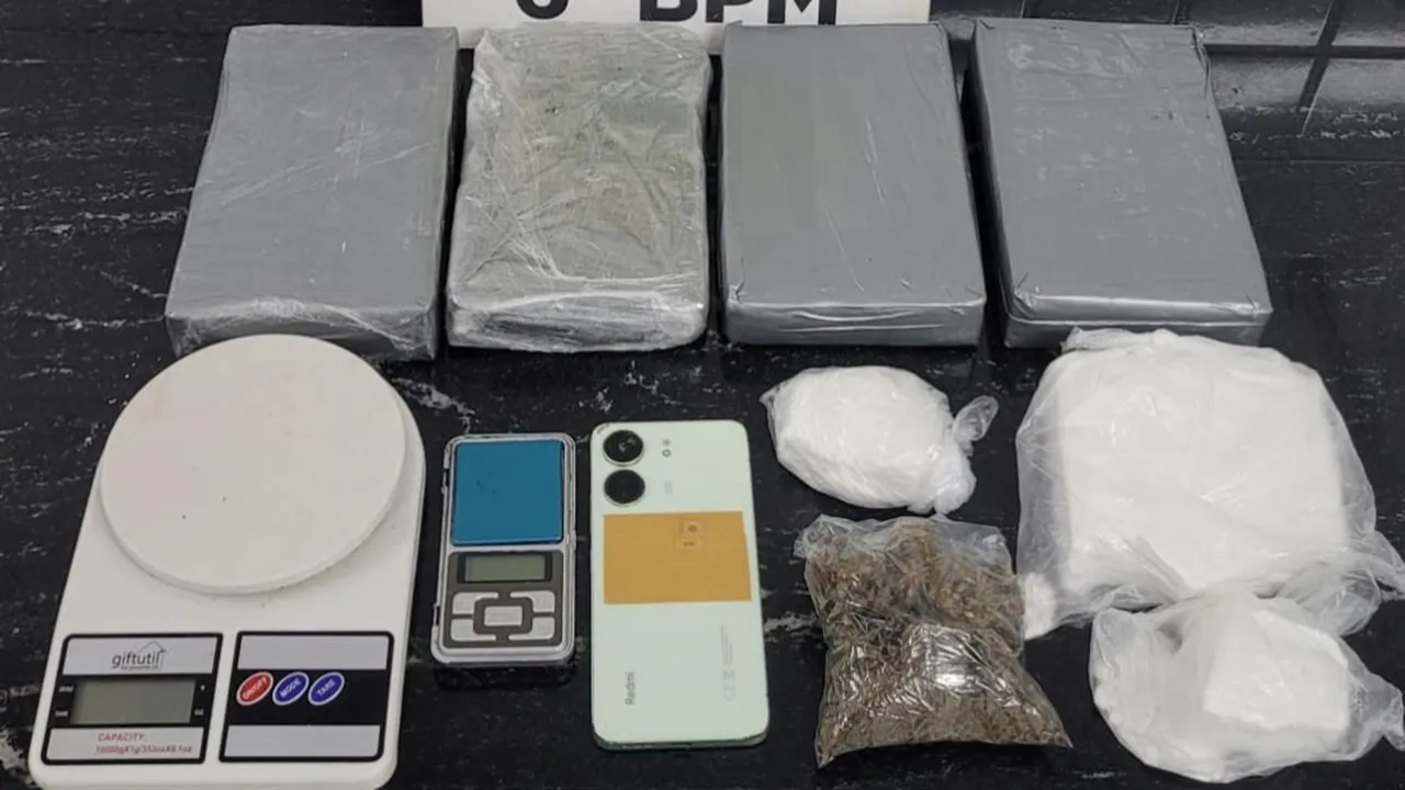 Com base nas denúncias, a equipe da ROCAM se deslocou até o endereço indicado e realizou a abordagem na residência. Durante as buscas, os policiais encontraram no quarto, em meio a roupas sujas, quatro tabletes de cocaína e porções fracionadas da droga, totalizando 4,928 quilos. Na sequência, no armário da cozinha, foi localizado um pote de vidro com 49 gramas de maconha, além de duas balanças de precisão, o que reforçou a suspeita de comercialização.