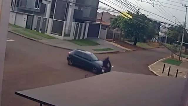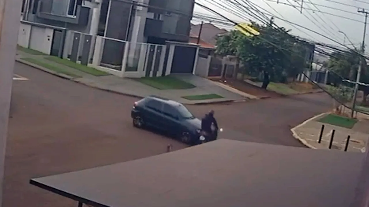 Uma colisão entre um Fiat Palio e uma Honda Biz deixou um motociclista ferido na manhã desta quarta-feira (25) no bairro Neva, em Cascavel. O acidente aconteceu no cruzamento das ruas Plínio Salgado e Visconde do Rio Branco e foi registrado por câmeras de monitoramento instaladas na região, que captaram o momento exato do impacto.