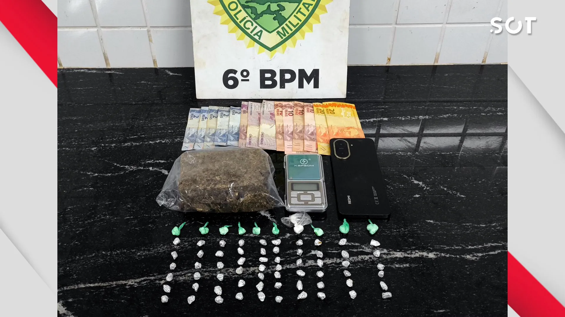 No imóvel, os agentes abordaram um homem de 20 anos. Durante a conversa com os policiais, ele relatou que havia uma porção de maconha dentro de uma mochila guardada em um dos quartos da casa. A equipe realizou buscas no local e encontrou a droga, além de uma balança de precisão, objeto frequentemente utilizado para fracionar entorpecentes para venda.