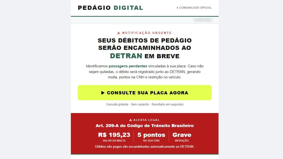 O esquema tem início com o disparo em massa de mensagens que imitam a identidade visual de concessionárias responsáveis pelas rodovias. Os conteúdos incluem boletos e links que aparentam ser legítimos, mas não possuem qualquer vínculo com empresas oficiais. A estratégia utiliza listas de e-mails e elementos gráficos semelhantes aos institucionais para aumentar a credibilidade e induzir o erro.