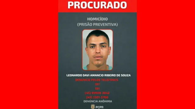 A Polícia Civil do Paraná, por meio da Delegacia de Homicídios de Cascavel, divulgou um comunicado solicitando a colaboração da população para localizar Leonardo Davi Amancio Ribeiro de Souza, investigado pela prática de crime de homicídio e que possui mandado de prisão preventiva em aberto.