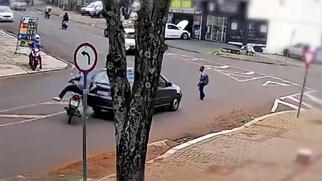 Nas imagens, é possível ver que um Fiat Palio Weekend reduz a velocidade para permitir a travessia de um pedestre. O motociclista, que seguia logo atrás, não consegue frear a tempo e acaba atingindo a traseira do veículo. O cruzamento é sinalizado com placas.
