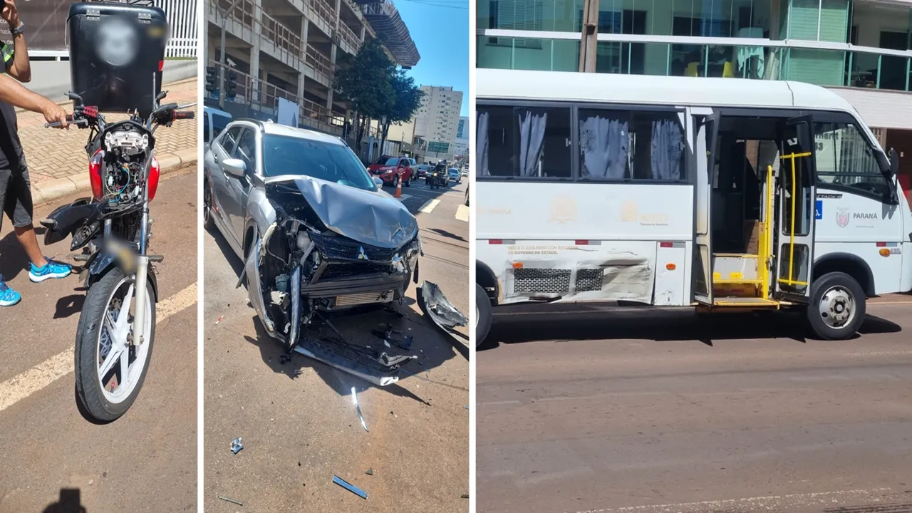 Ônibus avança sinal vermelho e provoca acidente com moto e carro em Cascavel