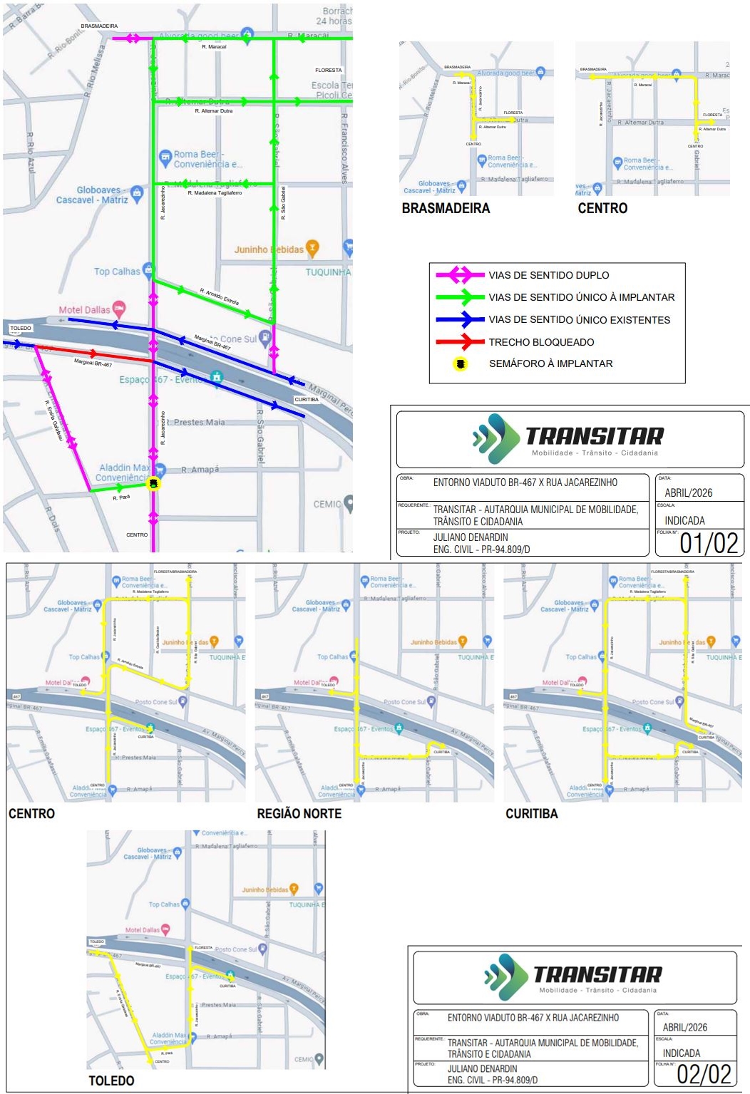 A Prefeitura de Cascavel inicia, na próxima segunda-feira (6), uma intervenção viária de grande porte no viaduto da Rua Jacarezinho sobre a BR-467 e nos acessos da região Norte. O projeto desenvolvido pela Transitar e executado pela Secretaria de Serviços e Obras Públicas (Sesop), vai impactar um dos pontos mais estratégicos da cidade: a região Norte, que concentra cerca de 130 mil moradores e tem, o viaduto da Jacarezinho, como uma das principais vias conectivas entre bairros como Floresta, Brasmadeira e Centro.