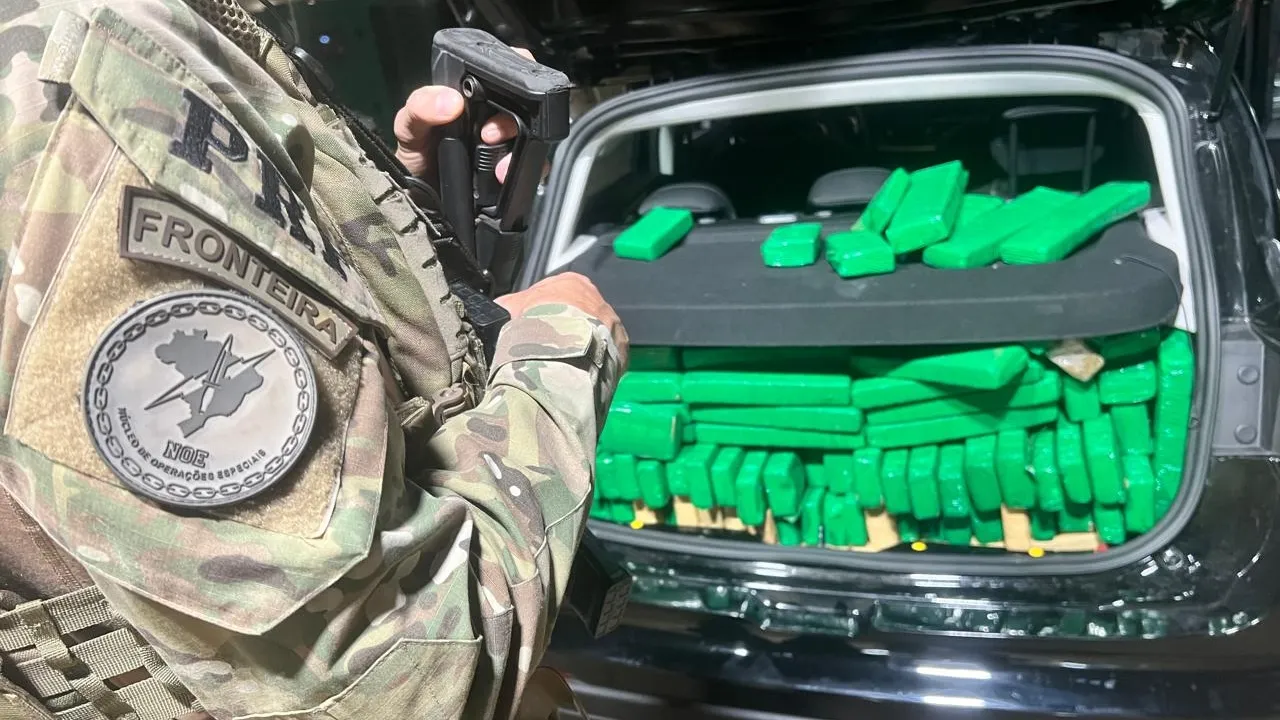 De acordo com a PRF, os agentes deram ordem de parada ao veículo e, durante a fiscalização, encontraram os entorpecentes espalhados sobre os bancos e no porta-malas. O automóvel apresentava registro de furto ou roubo e circulava com placas falsas.