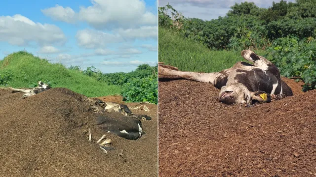 Durante a fiscalização, equipes do 2º Distrito Policial de Ponta Grossa constataram o descarte irregular de diversas carcaças de gado bovino a céu aberto, sem qualquer tipo de cobertura ou proteção do solo, o que favorece a contaminação ambiental. No local, também foi identificada uma lagoa de estrume sem tratamento adequado, indicando falhas graves no manejo de resíduos.