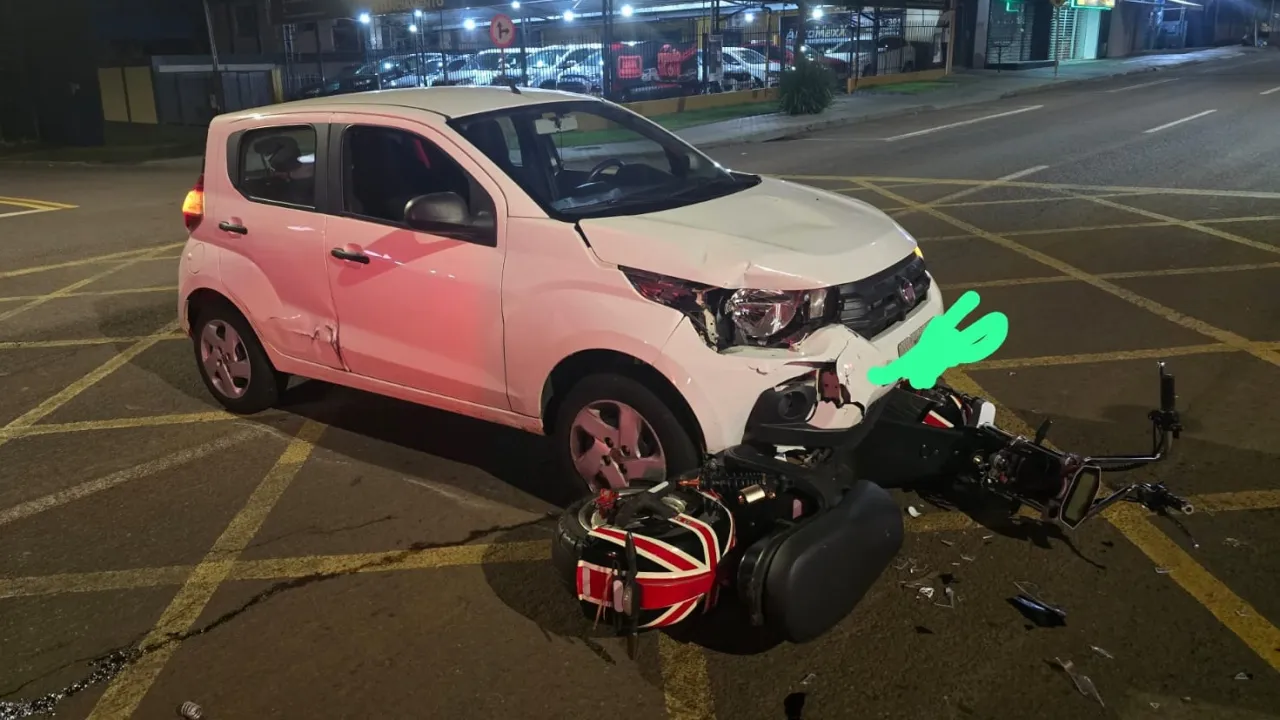 Um sinistro de trânsito registrado na noite da ultima segunda-feira (13/04]0, por volta das 23h20, deixou duas pessoas feridas no cruzamento das ruas Cuiabá e Presidente Bernardes, no bairro Neva, em Cascavel. A ocorrência envolveu um automóvel e um ciclomotor elétrico, mobilizando equipes de atendimento e fiscalização.