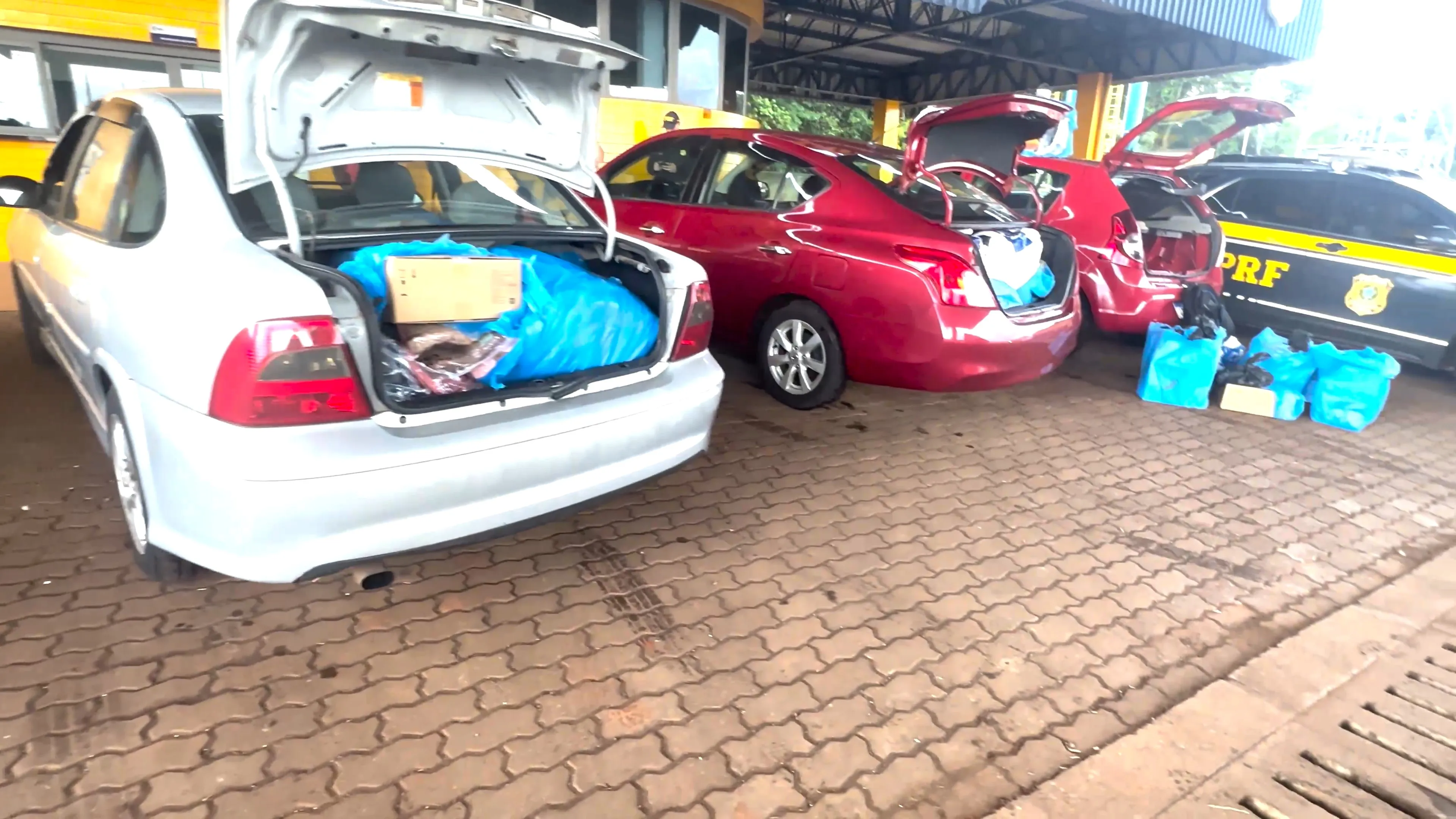Durante a fiscalização, os agentes realizaram a inspeção dos porta-malas e encontraram diversos volumes acondicionados em sacolas plásticas. Ao abrir as embalagens, foram identificados eletrônicos, cigarros eletrônicos, perfumes, roupas e acessórios variados. Parte das mercadorias também estava distribuída no interior dos veículos.