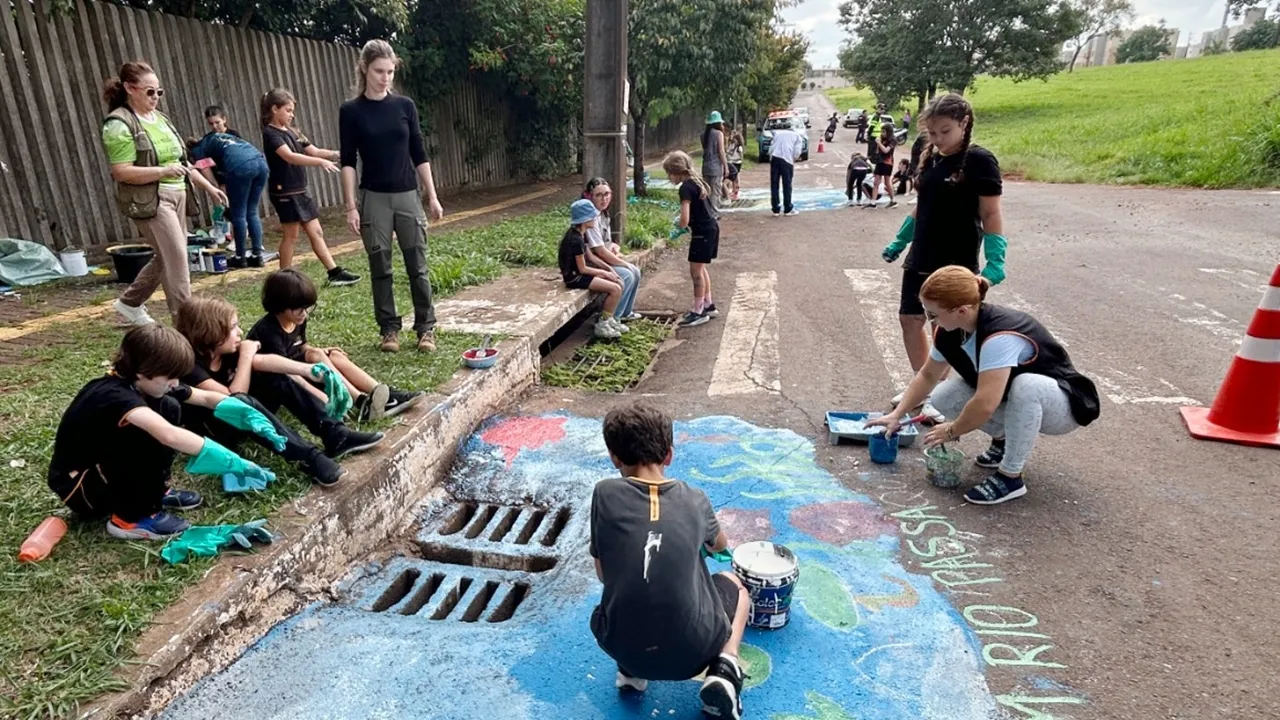 Crianças transformam bueiro em mensagem ambiental e reforçam cuidado com a água em Cascavel