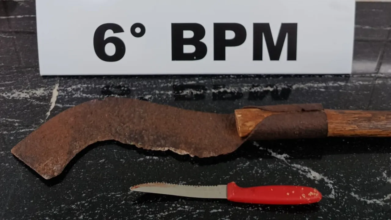 Ao chegar ao local, a equipe policial realizou a abordagem e identificou os envolvidos. A vítima relatou que havia ingerido bebida alcoólica com o autor antes de uma discussão. Durante o desentendimento, o homem passou a ameaçá-la e também as crianças utilizando uma foice. Em seguida, ele também utilizou uma faca de serrinha para continuar com as ameaças, chegando a passá-la pelos próprios pulsos.
