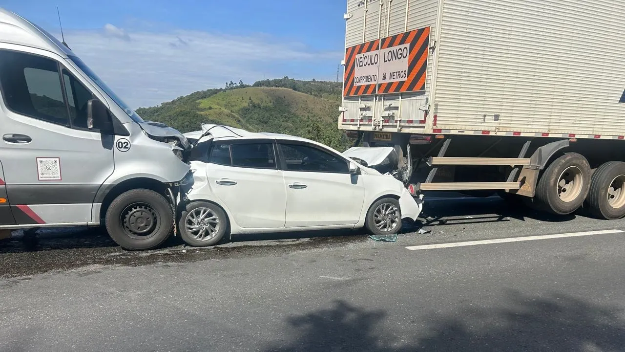 Acidente envolvendo duas carretas, uma van e um carro interdita faixa e causa lentidão na manhã deste sábado (25)