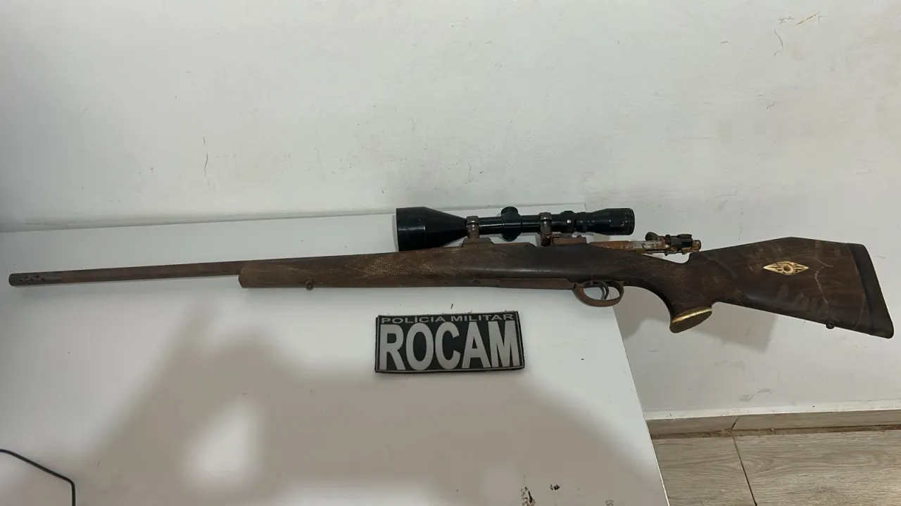 Na sequência, os policiais localizaram próximo ao suspeito uma arma de fogo portátil de calibre 7,62 mm. Conforme apurado no local, o homem também havia agredido a própria mãe, configurando situação de violência doméstica.