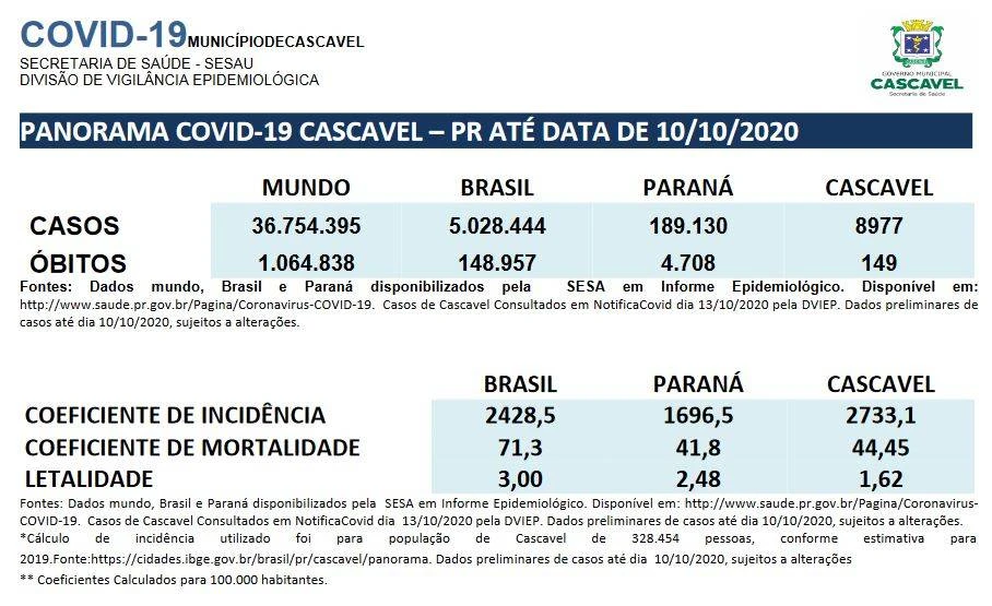 O Informe Epidemiológico desta quinta (15) da Vigilância Epidemiológica de Cascavel, que traz informações até o fechamento da semana epidemiológica n. 41 (10/10/20), a Secretaria de Saúde destaca os seguintes pontos: