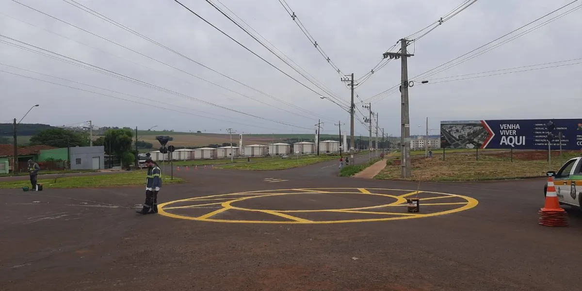 Condutores que trafegam pela Avenida das Pombas x Avenida das Torres devem ficar atentos à nova sinalização de trânsito no local. O setor de sinalização de trânsito da Transitar está executando nesta quinta-feira (29) uma minirrotatória no cruzamento, visando à organização do trânsito, com objetivo de melhorar a fluidez e a segurança na via.
