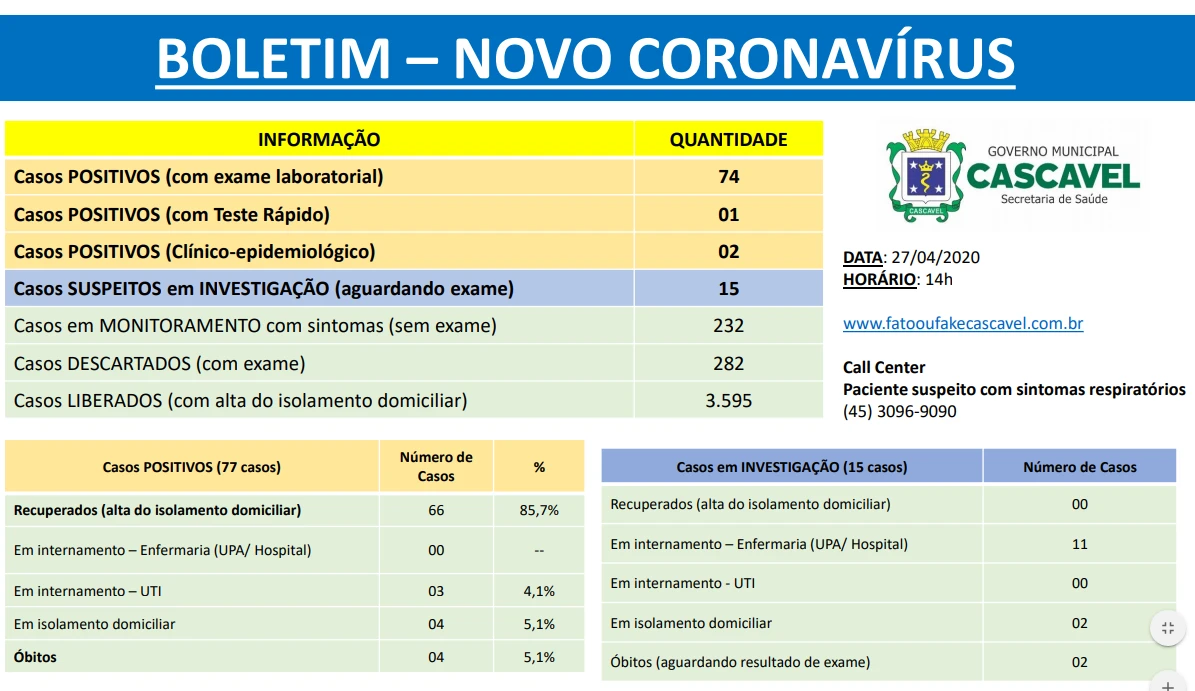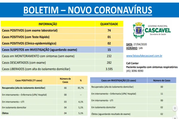 A Secretaria Municipal de Saúde divulga diariamente o boletim com as informações mais relevantes sobre os casos suspeitos e confirmados do novo coronavírus (Covid-19) em Cascavel.