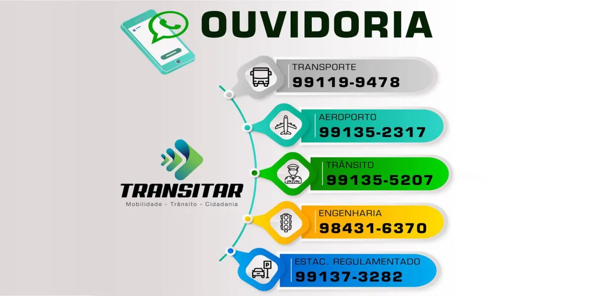 Ouvidoria da Engenharia de Trânsito – 98431-6370 – Inicialmente o Setor de Engenharia de Trânsito está atendendo, em horário comercial, ligações e na sequência, migrará também para aplicativo de mensagem. O cidadão pode solicitar demandas de sinalização de trânsito, estudos de nova sinalização, solicitar vitorias e projetos, além de apresentar sugestões e reclamações.