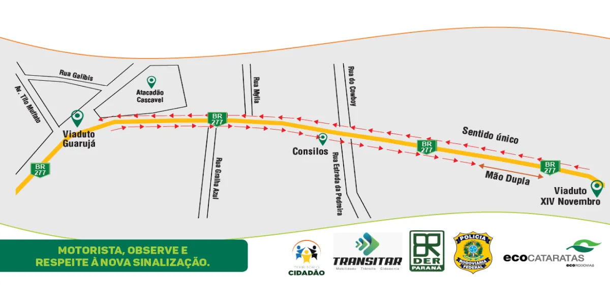 A partir deste sábado (12), o motorista que trafegar pelas marginais da BR-277, entre o viaduto do Guarujá e do XIV de novembro – Km 592 ao Km 595, em Cascavel precisará redobrar a atenção em relação a sinalização, pois o sentido da via passará a ser de mão única em ambos os lados.