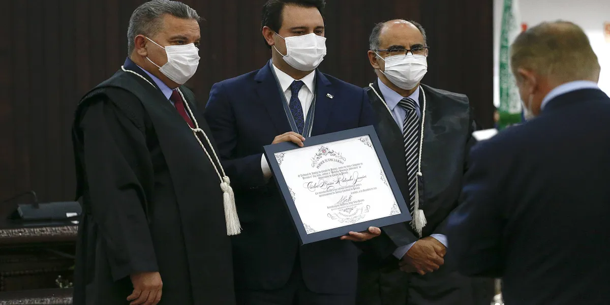O governador Ratinho Junior recebeu o diploma e a Medalha de Distinção Judiciária, entregues pelo atual presidente do TJPR, desembargador Adalberto Jorge Xisto Pereira, e pelo presidente eleito, desembargador José Laurindo de Souza Netto. A Medalha de Distinção Judiciária é um reconhecimento à contribuição do para o aprimoramento da Justiça Estadual do Paraná.