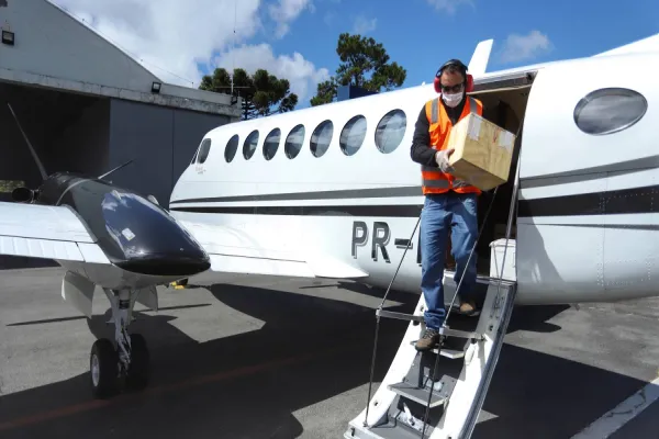 Além dos exames, as aeronaves ajudam a transportar caixas UN3373 para as regionais. Essas embalagens são próprias para material biológico.