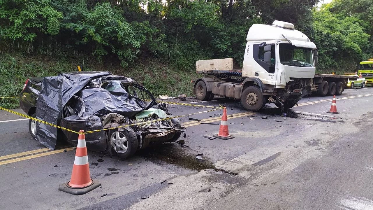 De acordo com a PRF, a colisão frontal envolveu um carro e um caminhão, aonde uma pessoa acabou morrendo..