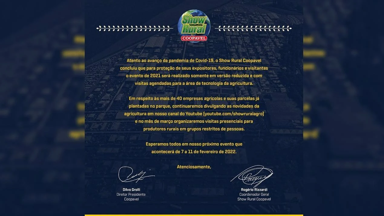 Devido a pandemia do novo coronavírus, o Show Rural 2021 será realizado em versão reduzida e com visitas agendadas para a área de tecnologia e agricultura.