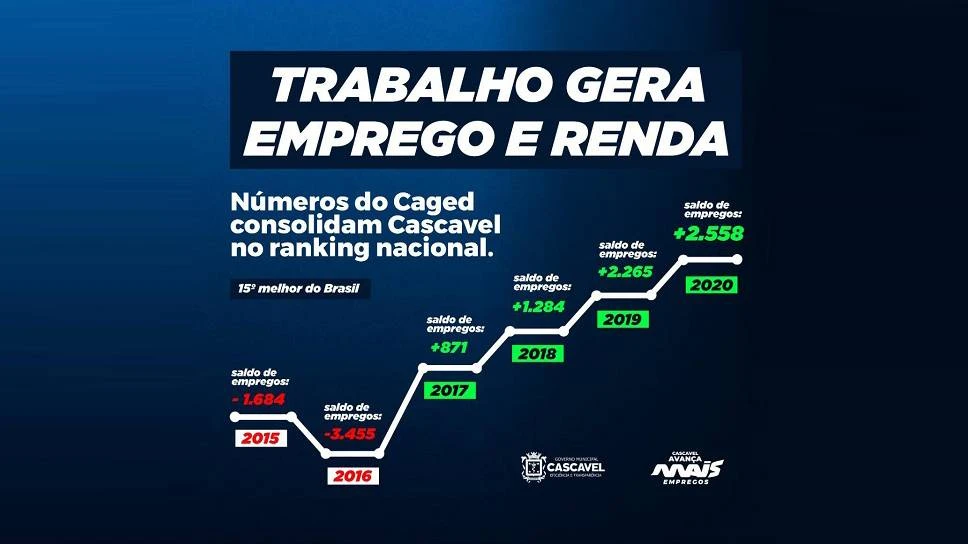 Números do Caged (Cadastro Geral de Empregados e Desempregados) divulgados nesta quinta-feira (28) mostram que Cascavel gerou 2.558 postos de trabalho no ano passado. Isso representa 4,85% de todos os empregos gerados no Paraná, que abriu 52.670 vagas. O melhor saldo, até então, era de 2014, quando foram criados 4.022 empregos. Em 2015 e 2016 a variação em Cascavel foi negativa e só iniciou a recuperação em 2017.