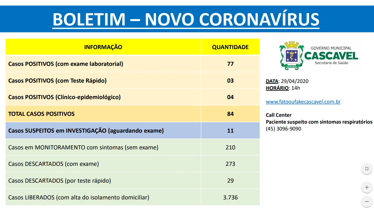 Chega 84 casos confirmados com coronavírus (Covid-19) em Cascavel