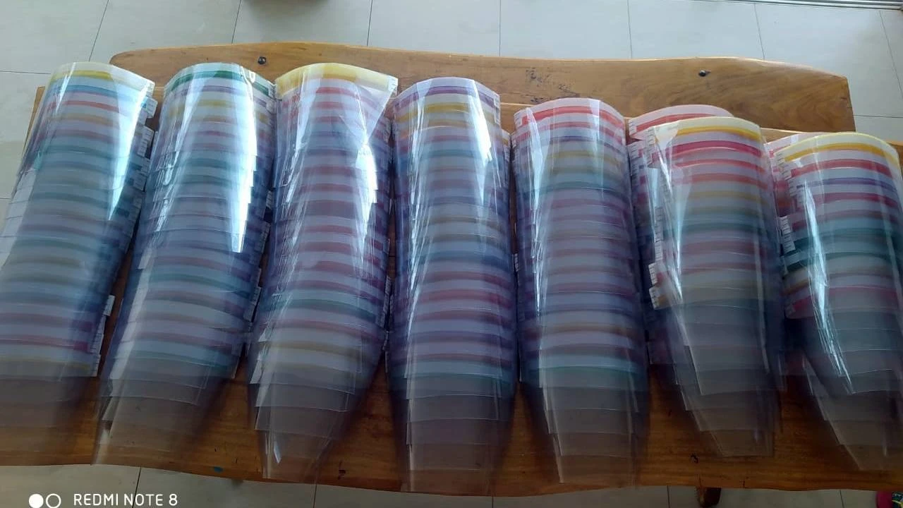 As máscaras são compostas por materiais simples e de fácil manuseio: polietileno (espaguete de piscina), elástico de roupa, acetato e fita dupla face. Na primeira semana de quarentena, Tácio e Katiane produziram 120 peças para o hospital municipal. A próxima meta é a produção de mais 370 unidades.