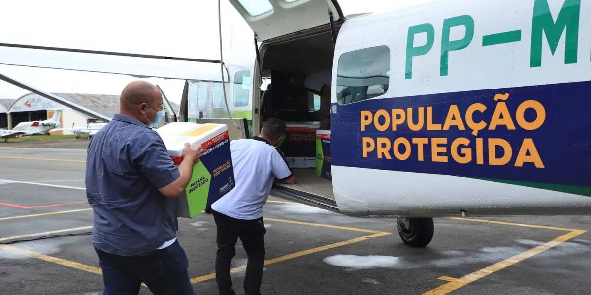 LOGÍSTICA – Como forma de acelerar o processo de imunização dos paranaenses, o Governo do Estado repetiu a logística de distribuição das vacinas por via terrestre e aérea. As regionais próximas à Capital (Paranaguá, Metropolitana, Ponta Grossa, Irati, Guarapuava, União da Vitória e Telêmaco Borba) retiraram pela manhã no Cemepar. Para as outras 15 divisões de saúde, aquelas mais afastadas, o transporte foi feito por meio de dois aviões e um helicóptero que pertencem à Casa Militar do Paraná.