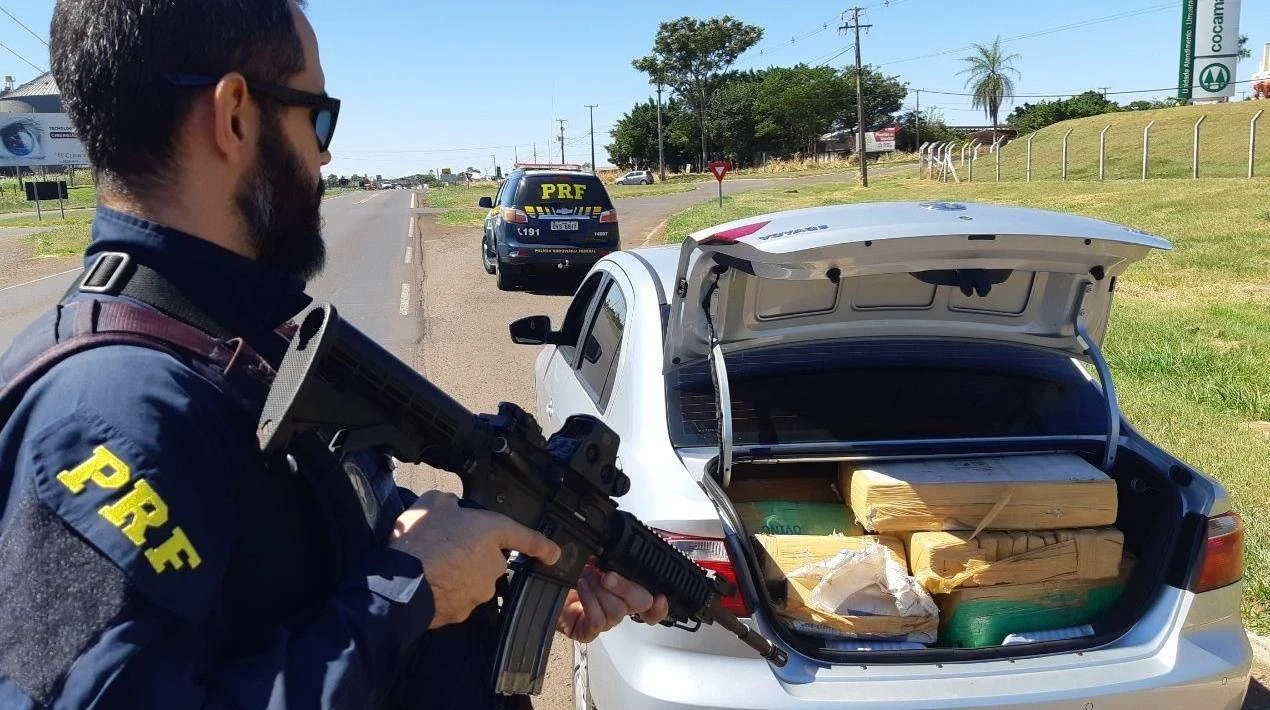 O motorista inicialmente hesitou, mas na sequência acabou por obedecer a ordem de parada. A droga estava no banco traseiro e no porta-malas do veículo.